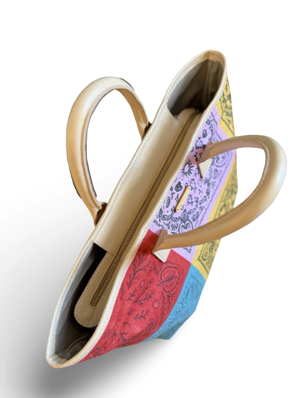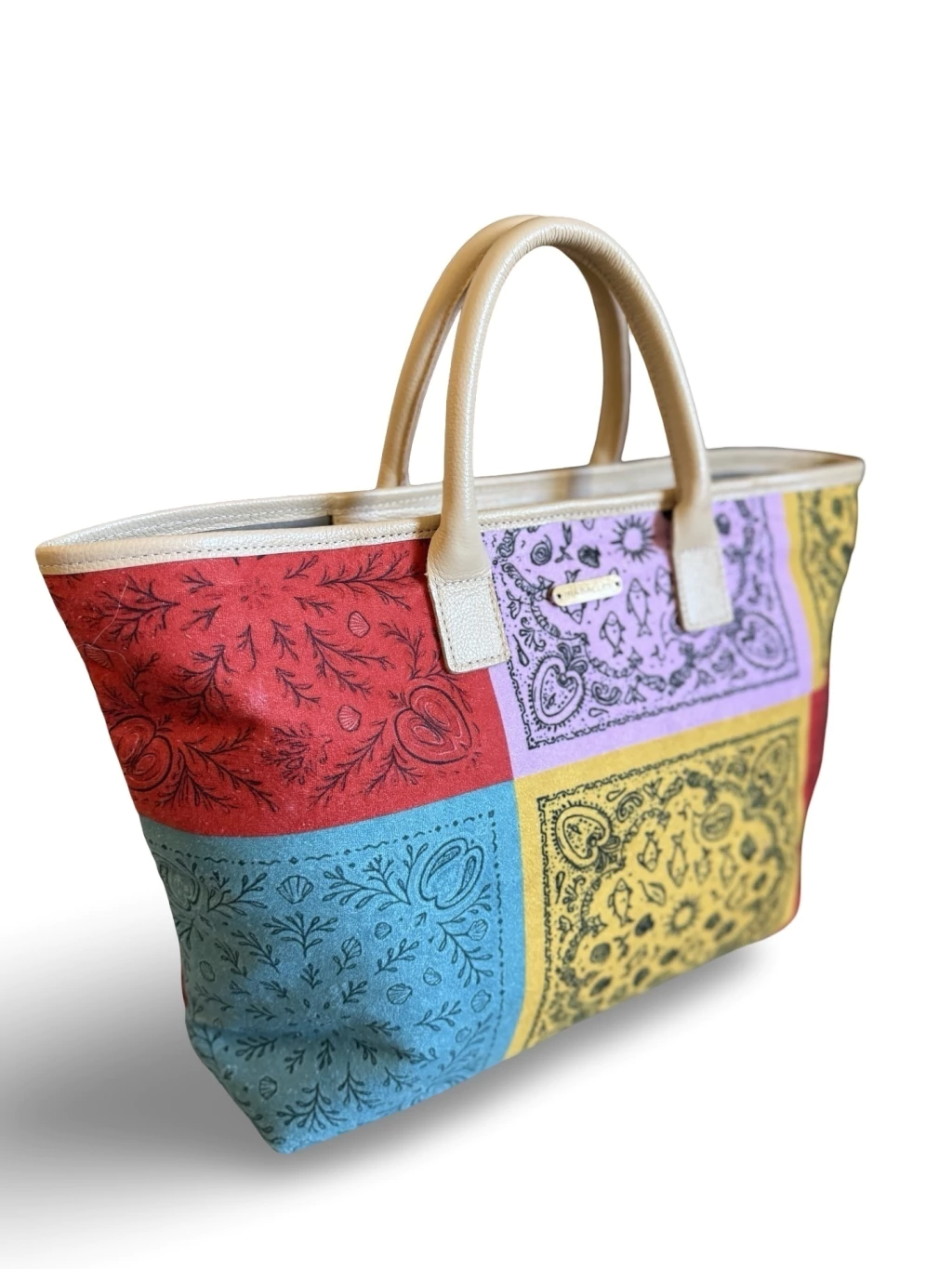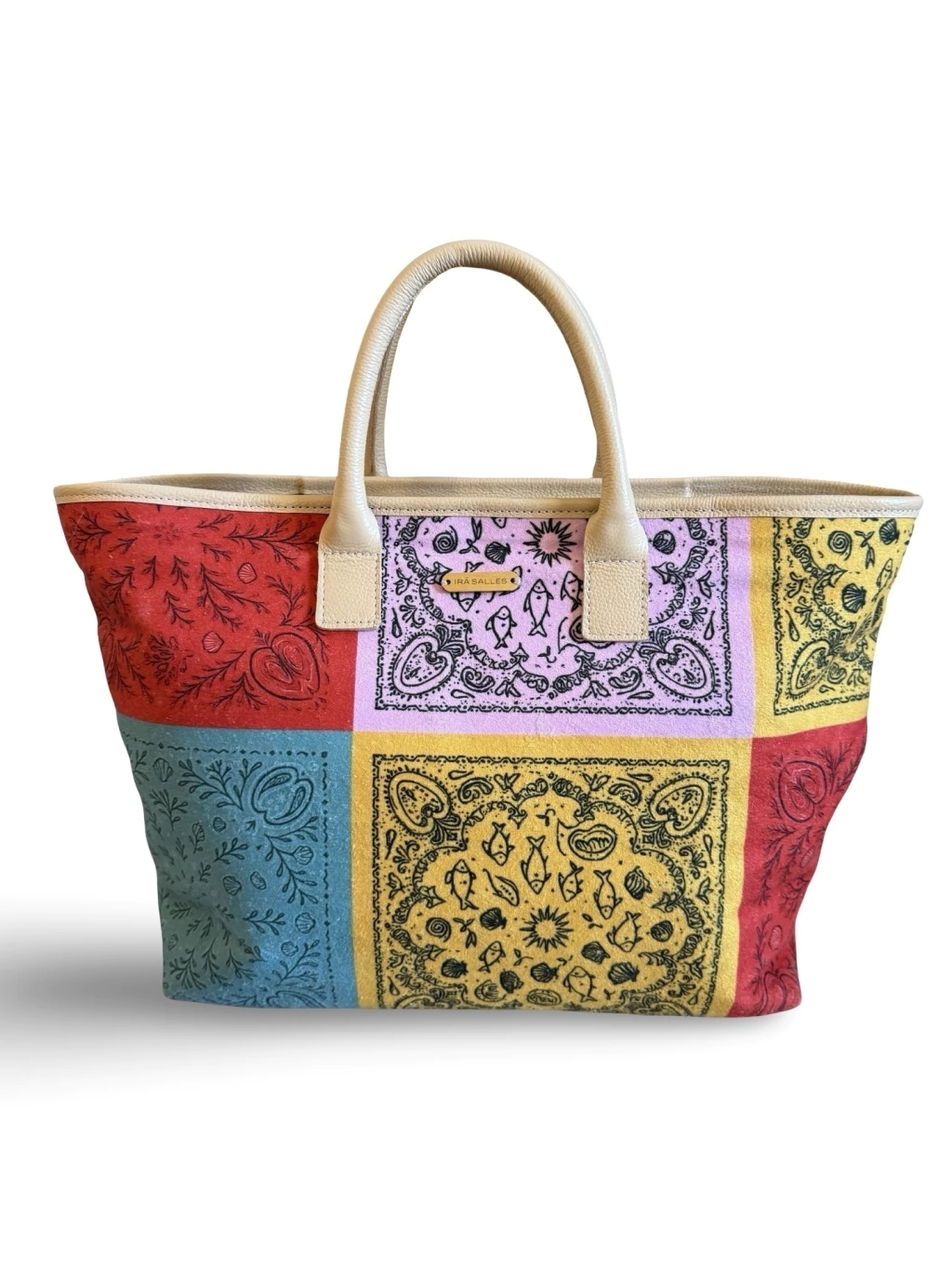 Bolsa em tecido atoalhado com alça em couro e fechamento com ziper