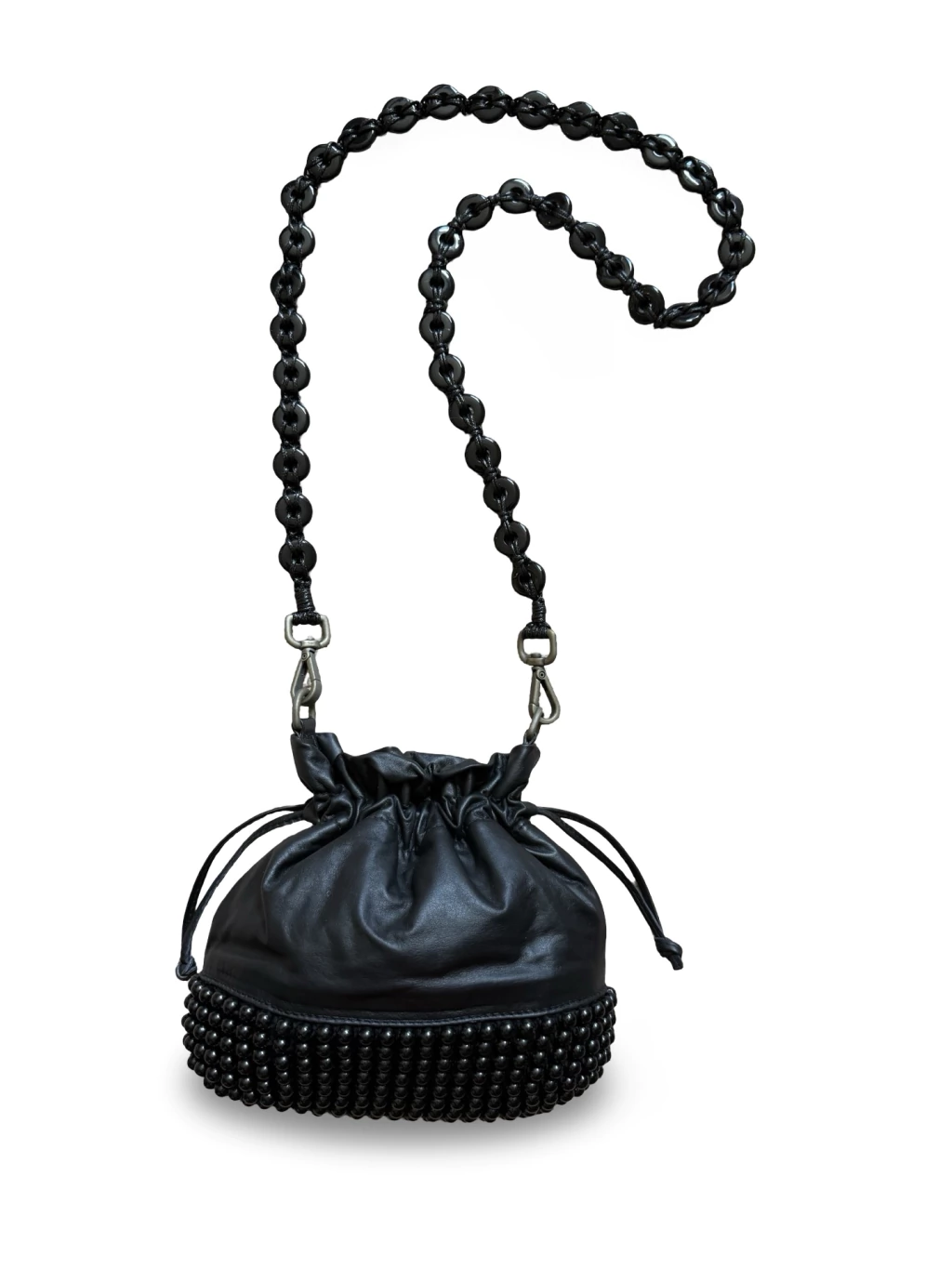 Bolsa em crochê com contas e detalhes em couro de vestuário. Alça em macramê com contas