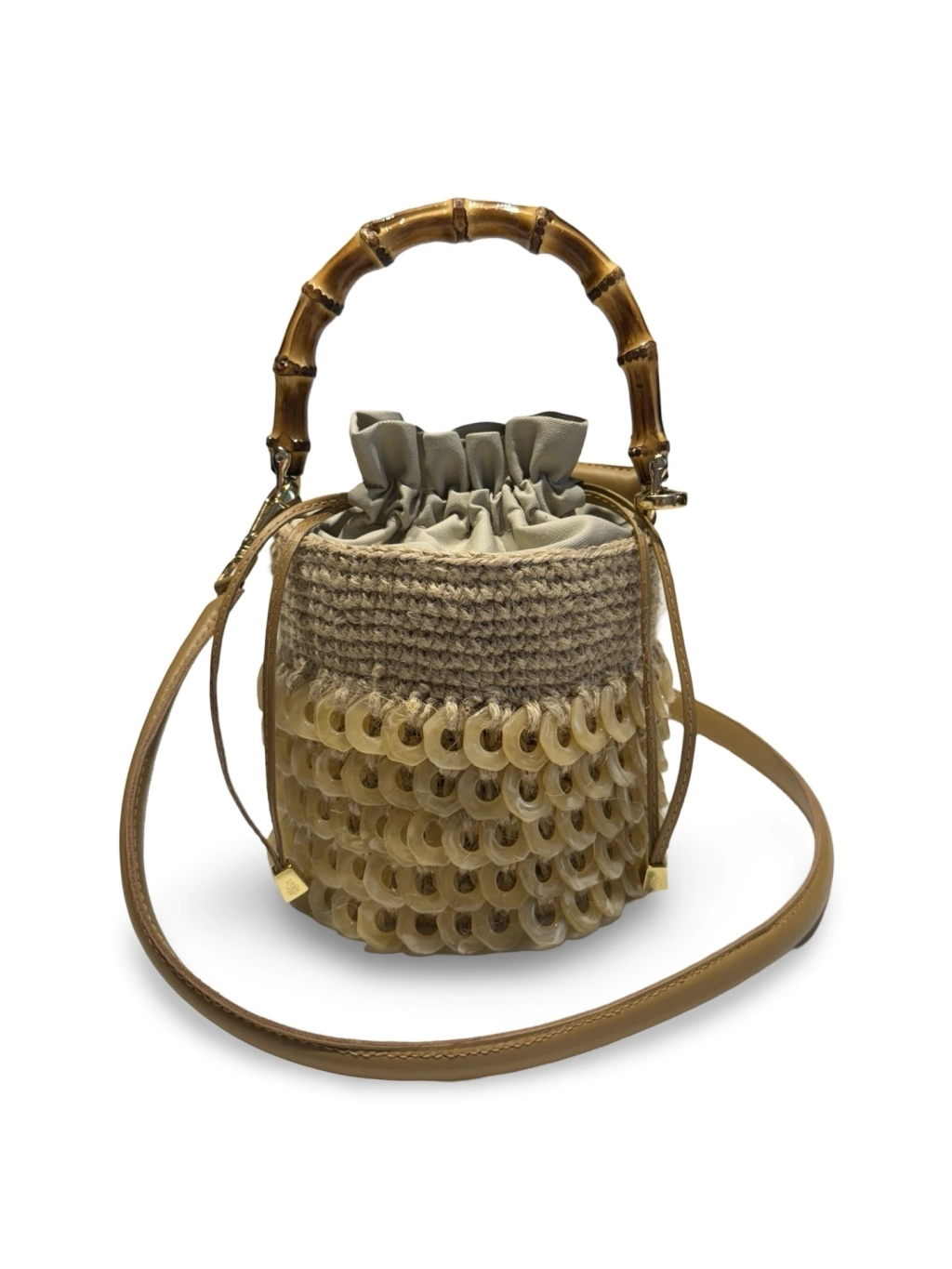Bolsa em crochê de fio de sisal com detalhes em acrílico e alça de bambu. Possui uma alça longa tiracolo em couro